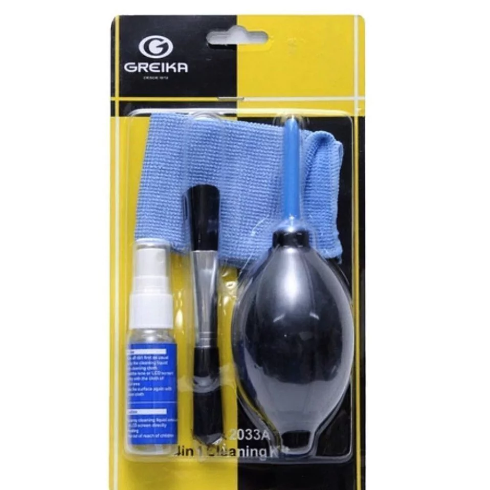 Kit de limpeza de câmeras, objetivas e eletrônicos em geral, contem os artigos essenciais necessários para a manutenção e os cuidados apropriado de suas câmeras e acessórios. Flanela para limpeza de lentes e filtros com total segurança e também liquido (embalagem com 30ml em spray) de limpeza de lentes e permitir e facilitar o cuidado com os cristais ou vidros óticos, segue também uma bomba de ar tamanho médio e pincel.